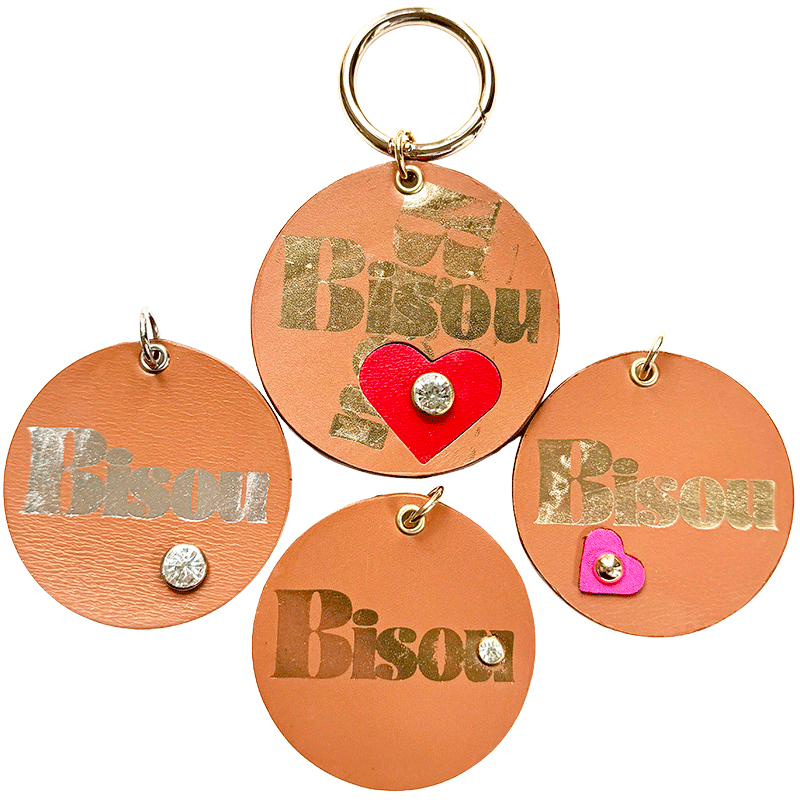 This round charm is crafted from upcycled camel calf leather sourced from luxury houses’ surplus. The warm leather is hot-stamped with the word “bisou” in either gold or silver, with a subtle irregularity that highlights the artisanal process and the natural grain of the leather.