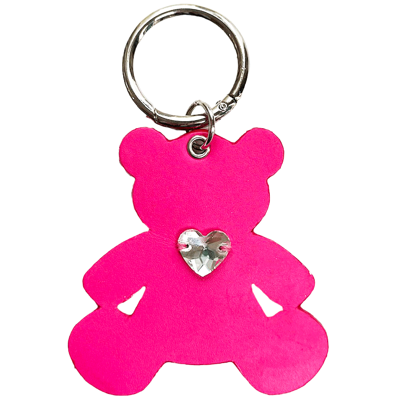 “Bear” charm in upcycled pink calf leather. Rhinestone heart, silver ring. Handmade in Paris. Bag charm/key ring.