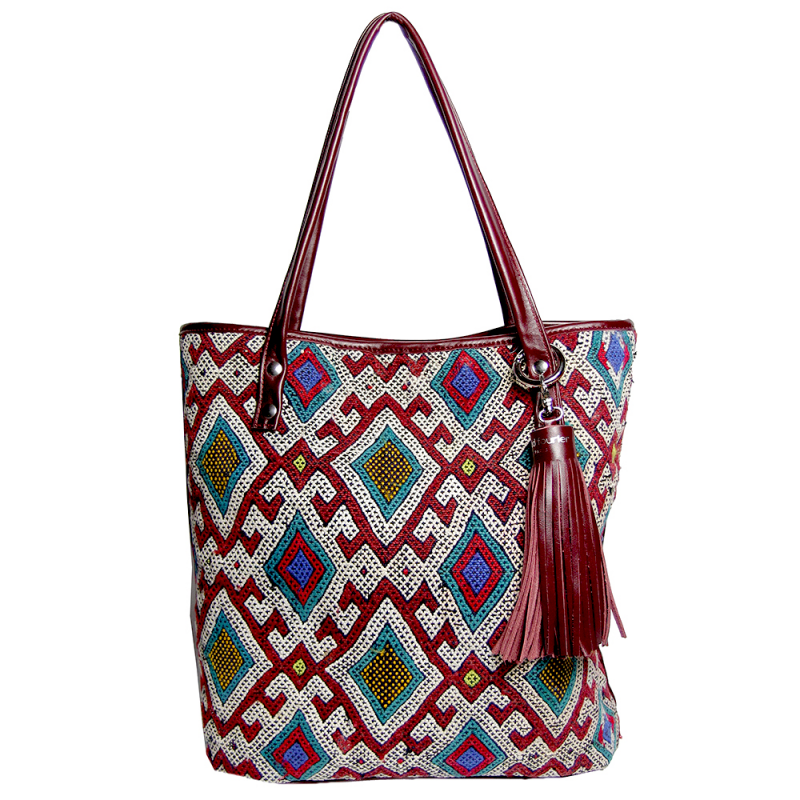 A shopping bag in kilim and leather created by the Parisian designer Maud Fourier is a unique ethnic chic handbag.
