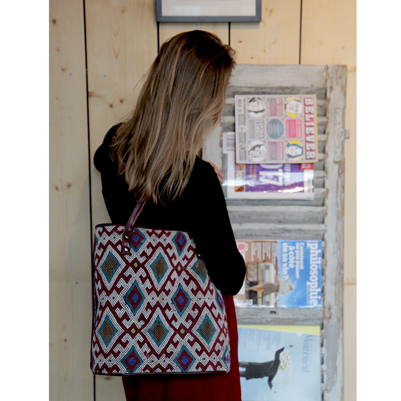 Shopping Bag made with upcycled Kilim nicely mixed with plum leather. Made in Paris.