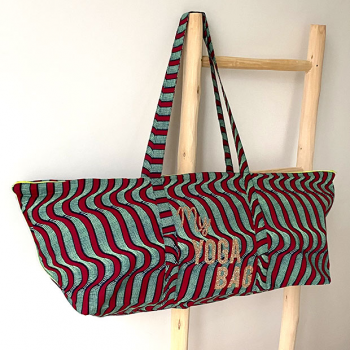 Our personalized yoga bag in red and navy blue print wax cotton has been designed for all yogis who want to carry their yoga mat and their outfit in a stylish and suitable bag.