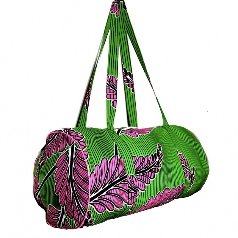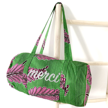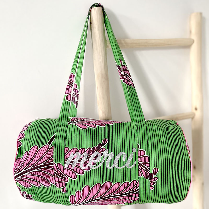 MERCI bag in green and pink wax printed cotton. Customized with its glitter message in our Parisian workshop. A practical and stylish bag that will hold your essentials.