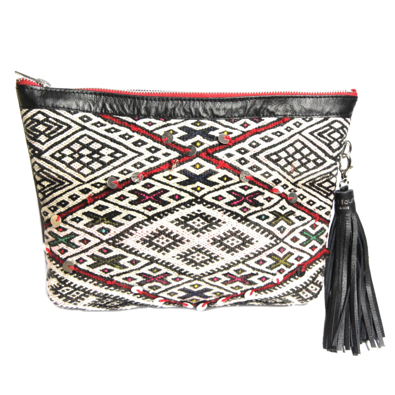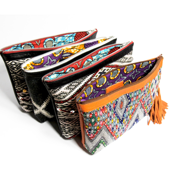Our pouch is both supportive and eco-responsible, because it's made from a vintage Berber Kilim cushion that we recycle. It's also sustainable because an association of Moroccan women with disabilities has been assembling these clutches for us since 2017.