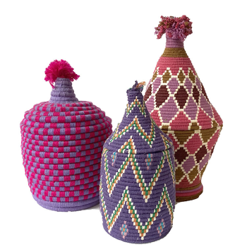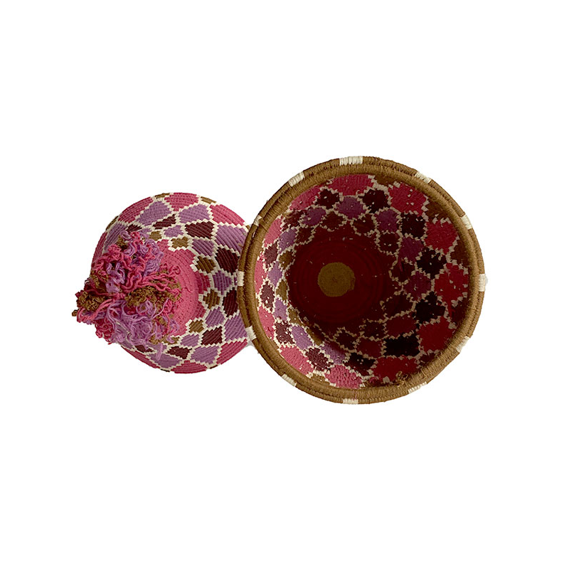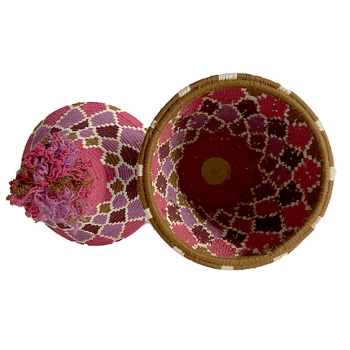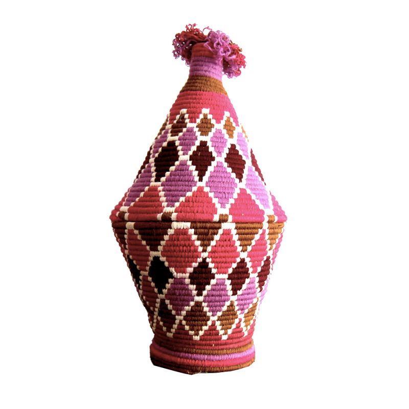 This pink and brown berber box, made from wicker and wool using a braiding technique specific to the Berber women of the Moroccan Atlas tribes, is a superb decorative object. With its ethnic motifs, it fits in perfectly with the bohemian chic trend.