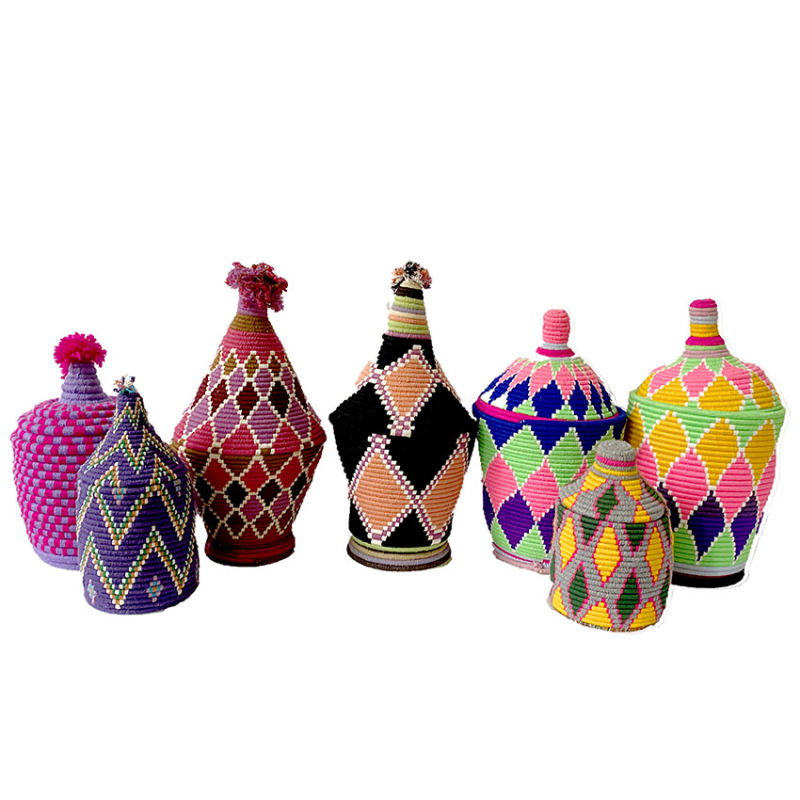 Our Berber boxes have been handmade in Morocco from woven palm leaves and coloured wool by women's cooperatives with whom we've been working on a fair trade basis for years. Each one is unique and the fruit of a craftswoman's creativity, and its irregularities are part of its charm.