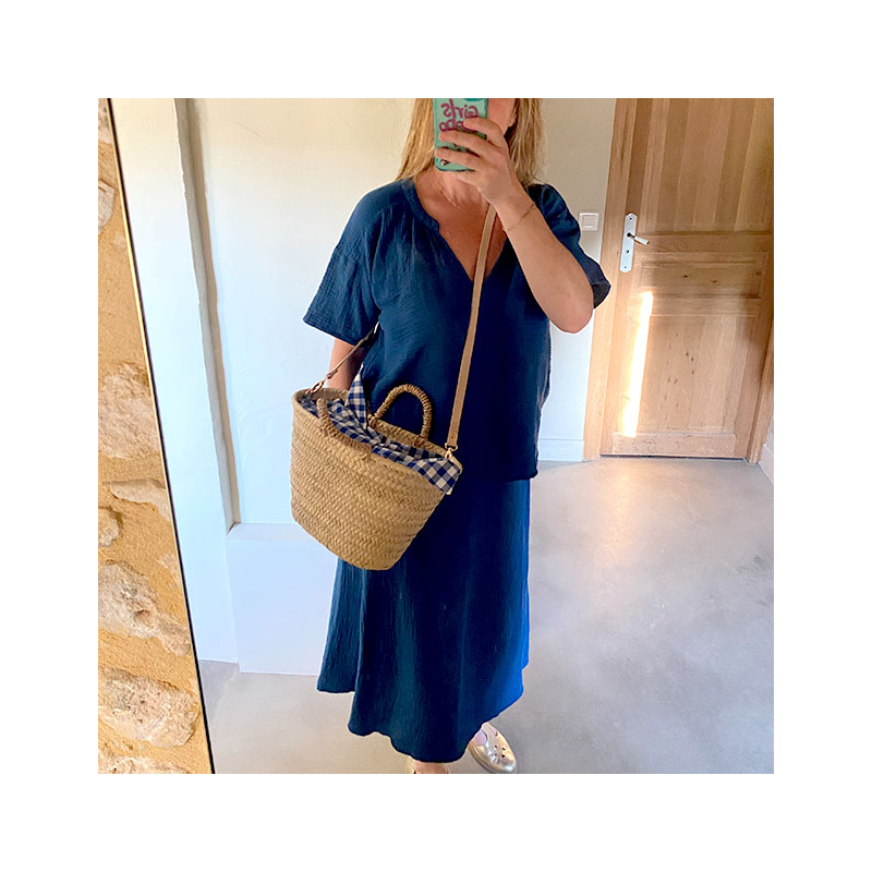 A removable shoulder strap in natural leather will allow you to carry it on the shoulder or crossed. So your basket will be so practical that you will not want to leave it. Fully lined with bleu gingham cotton, it is adorable! This basket is a small size.
