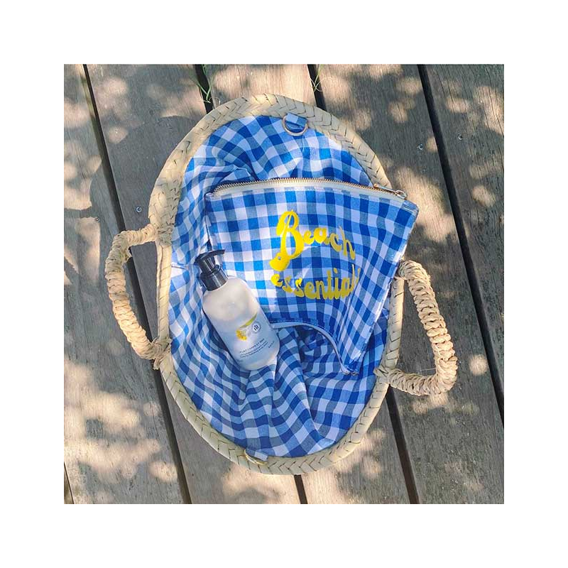 Mini beach basket Brigitte made of woven palm leaves by cooperatives of women artisans in Morocco and then customized with its lining in Paris.
