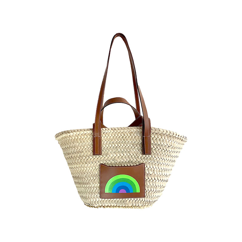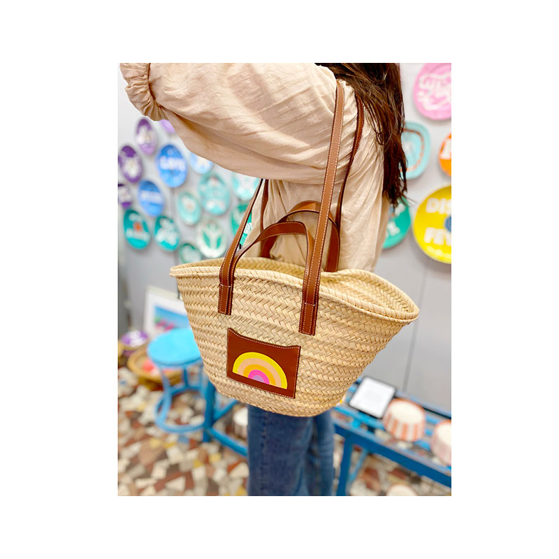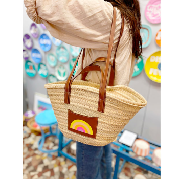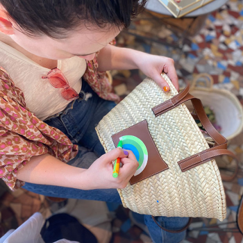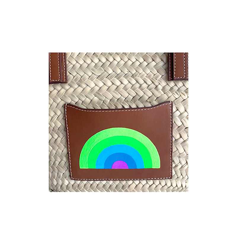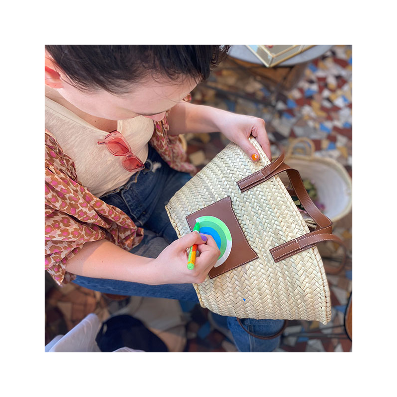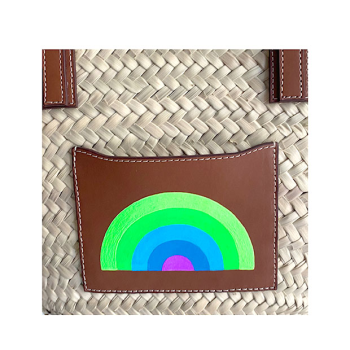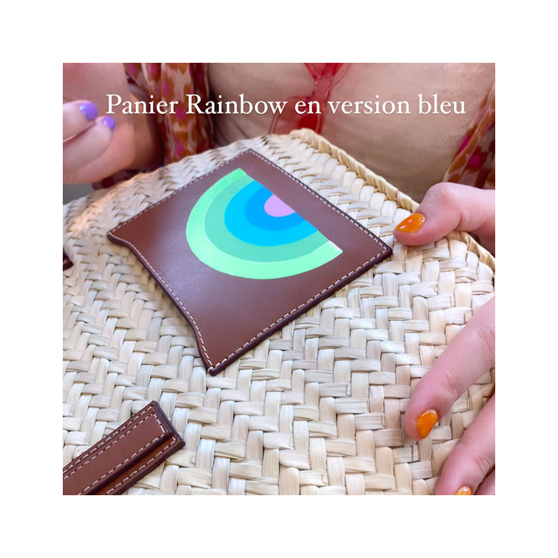The Rainbow basket, with its leather pocket hand-painted by one of our artists, is sublime. Crafted by the finest artisans, its genuine leather handles are ideal. A perfect size to hold your essentials. A removable cotton pencil case is the accessory we've imagined for you, so that it's perfect right to the end.