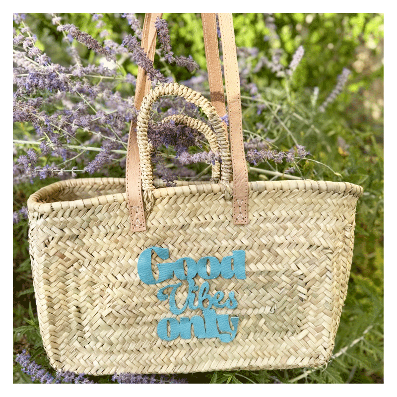The Good Vibes Only basket, handcrafted from woven palm leaves and upcycled grained calf leather cut in our Parisian studio, blends urban functionality, positive energy, and artisanal charm.