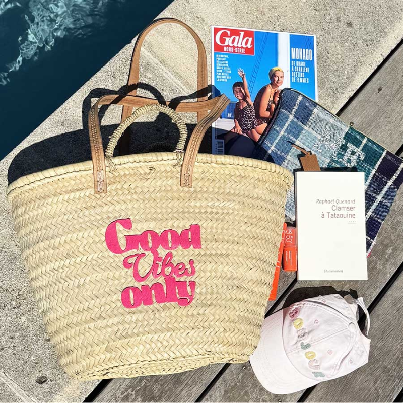 The Good Vibes Only basket, handcrafted from woven palm leaves and upcycled grained calf leather cut in our Parisian studio, blends urban functionality, positive energy, and artisanal charm.