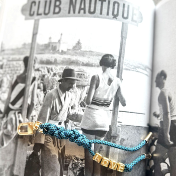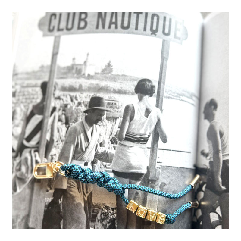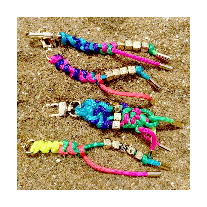 Un bijou de sac ou porte-clé en corde de parachute tressée et perles or et strass pour vos clés ou votre sac à main. A associer avec nos autres bijoux de sac en cuir pour créer votre gri-gri personnalisé !Existe aussi avec les mots Love, Bisou, Happy ou Paris.