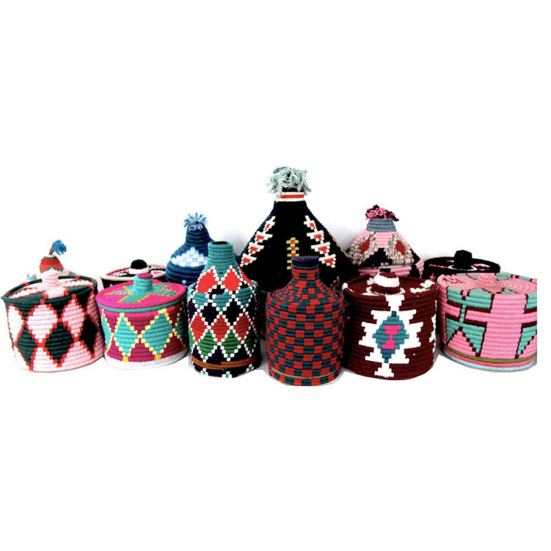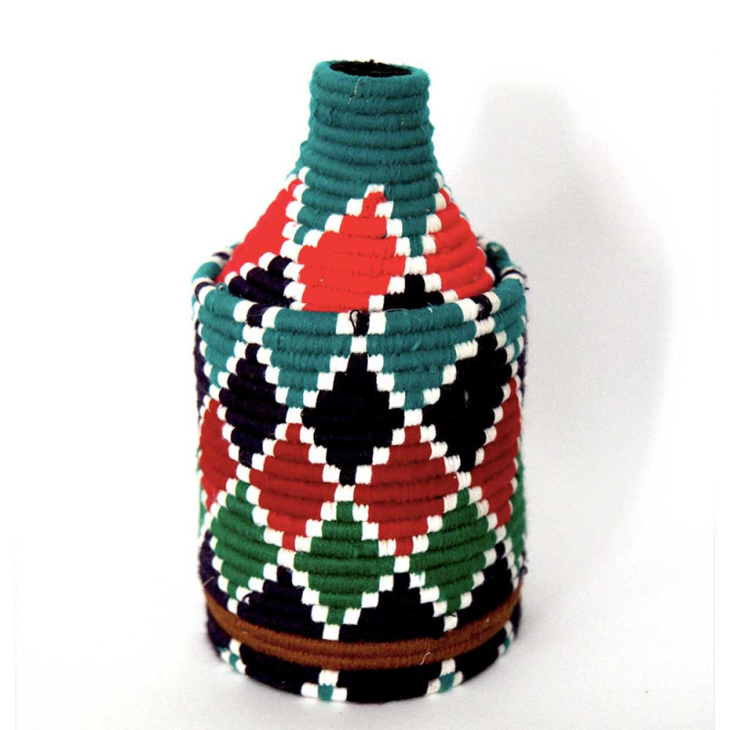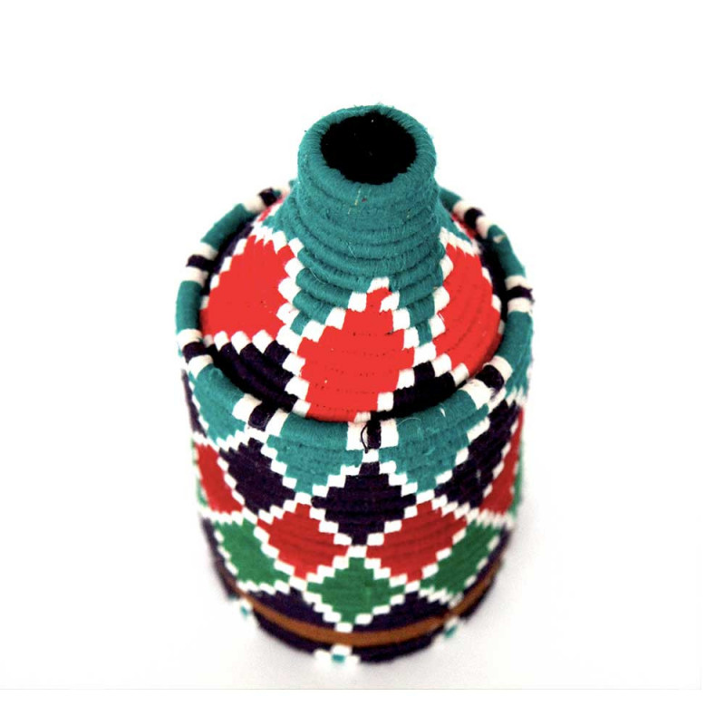 Cette boîte multicolore est réalisée en osier et laine suivant une technique de tressage propre aux femmes berbères des tribus de l'Altlas marocain qui les fabriquent artisanalement.