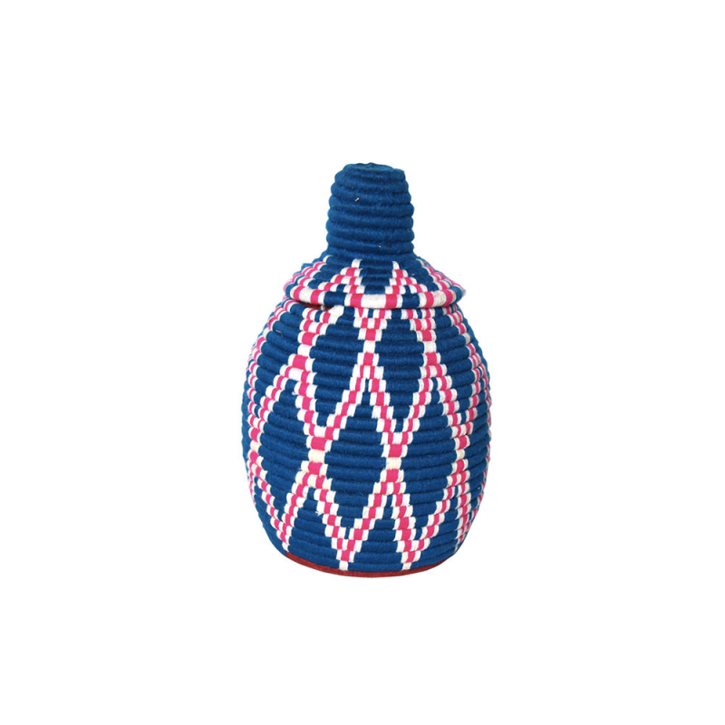 Cette boîte bleue et rouge réalisée en osier et laine suivant une technique de tressage propre aux femmes berbères des tribus de l'Altlas marocain est un superbe objet de décoration totalement unique.