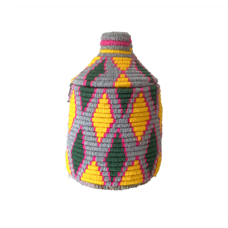 Cette petite boîte réalisée en osier et laine gris et jaune suivant une technique de tressage propre aux femmes berbères des tribus de l'Atlas marocain est un superbe objet de décoration. Avec ses motifs ethniques elle s'ancre parfaitement dans la tendance de déco bohème chic.