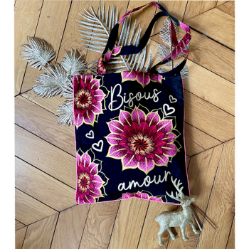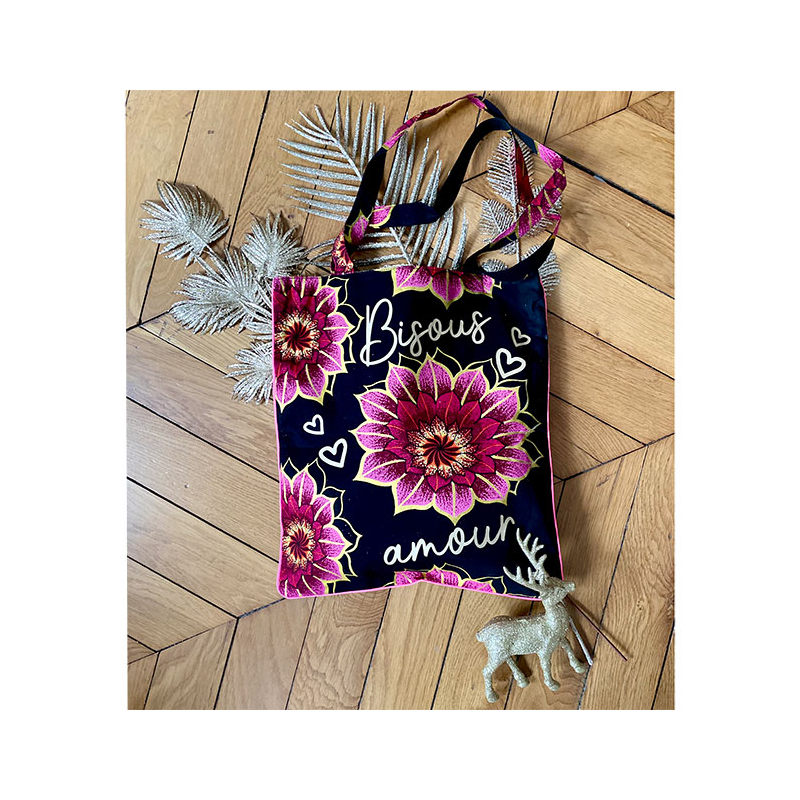 Notre Tote bag personnalisé Bisous en coton wax est un adorable sac à main. D'une format idéal il vous suivra au quotidien et son imprimé original le rend aussi stylé que vous !