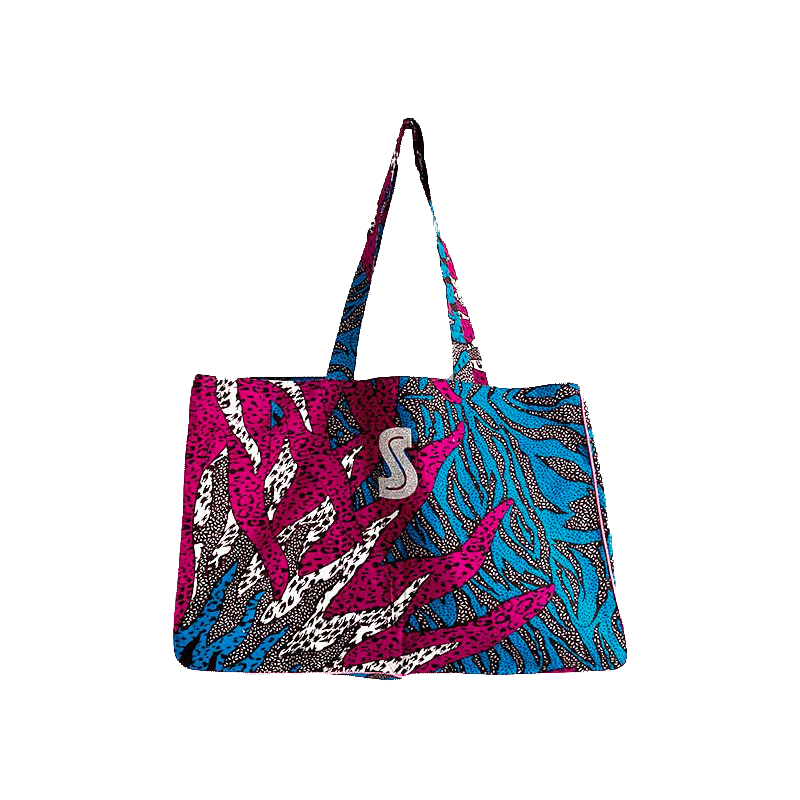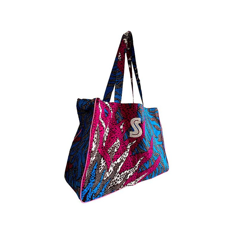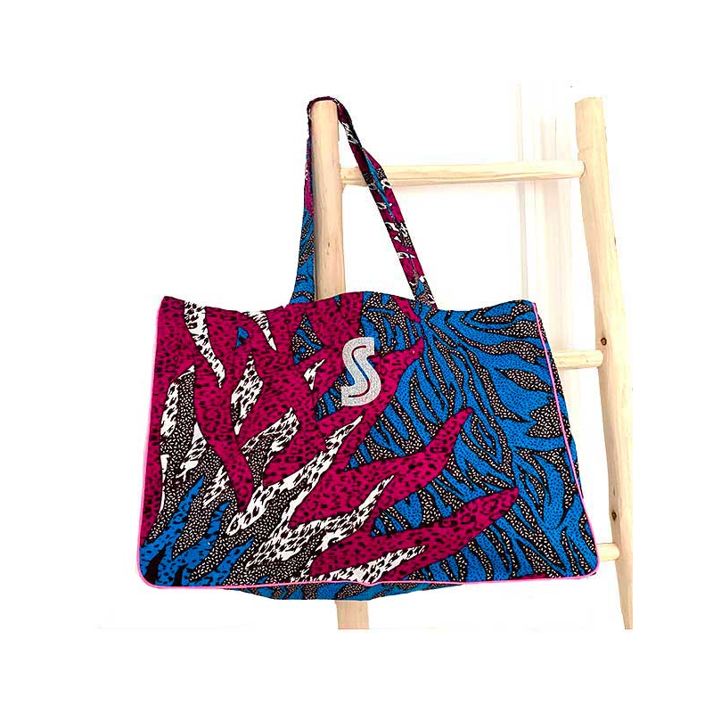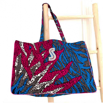 Vous avez envie d'un maxi cabas en coton personnalisé avec vos initiales ? Nous le personnaliserons pour vous dans notre atelier à Paris. Son imprimé façon "tigre" de coloris bleu électrique et rose vous fera rugir de plaisir ! A vous de choisir les lettres que vous voulez et votre cabas en coton imprimé wax deviendra un cabas unique.