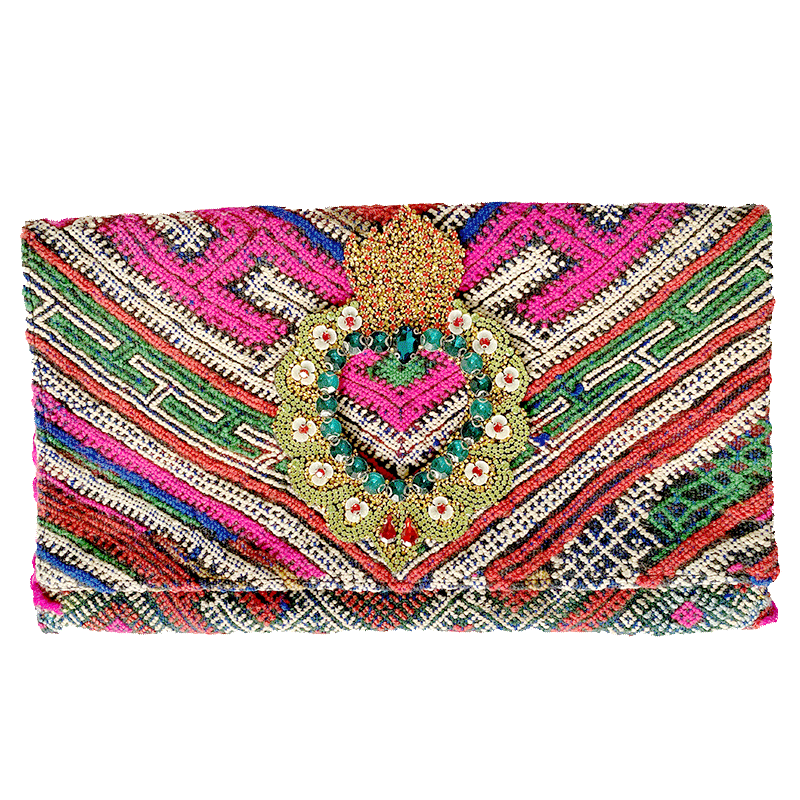 Ce sac au format pochette en Kilim multicolore vintage de notre collection slow fashion est sublime ainsi personnalisée avec son coeur en strass. Confectionnée à partir d'un coussin kilim berbère ancien que nous recyclons puis personnalisée dans notre atelier à Paris cette pochette est une pièce unique. Se porte à la main ou à l'épaule gràce à sa bandoulière amovible.