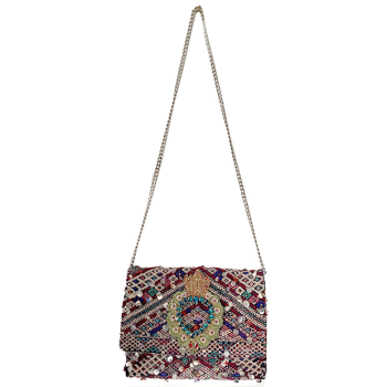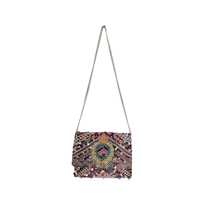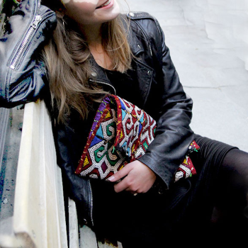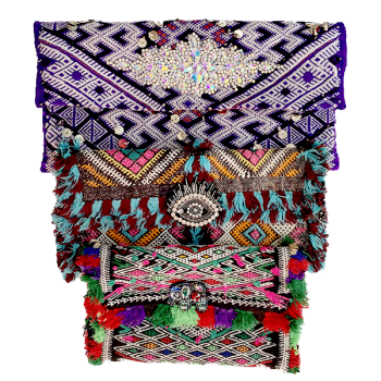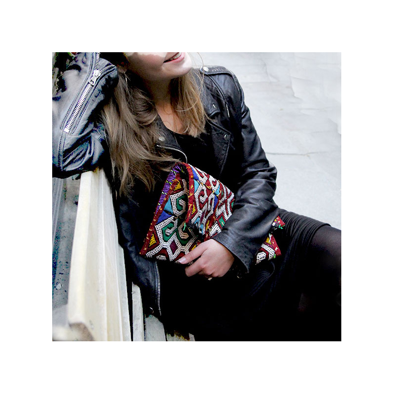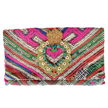 Ce sac au format pochette en Kilim multicolore vintage de notre collection slow fashion est sublime ainsi personnalisée avec son coeur sacré tout en strass. Confectionnée à partir d'un coussin kilim berbère ancien que nous recyclons, cette pochette est unique. Un sac à main au style bohème avec des motifs ethniques tissés de manière ancestrale. Se porte à la main ou à l'épaule avec une bandoulière chaîne amovible.
