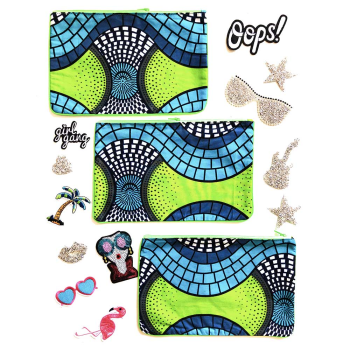Le coton imprimé wax étant un tissu imprimé avec des motifs, leur placement sera différent sur chaque trousse. Nous vous montrons quelques photos à titre d'exemple mais la vôtre pourra être légèrement différente mais les coloris seront les mêmes.