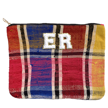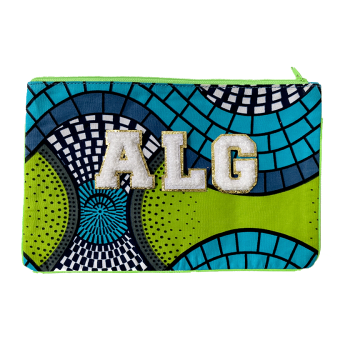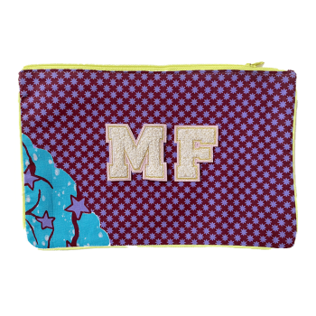 Une trousse en coton vert, jaune et violet que vous pouvez personnaliser en choisissant les initiales ou lettres bouclette qui viendront la customiser. A vous de choisir les lettres que vous souhaitez et nous les ajouterons pour vous. Ainsi votre trousse à maquillage sera unique. Une jolie idée de cadeau customisé ! Le prix inclut 3 initiales.